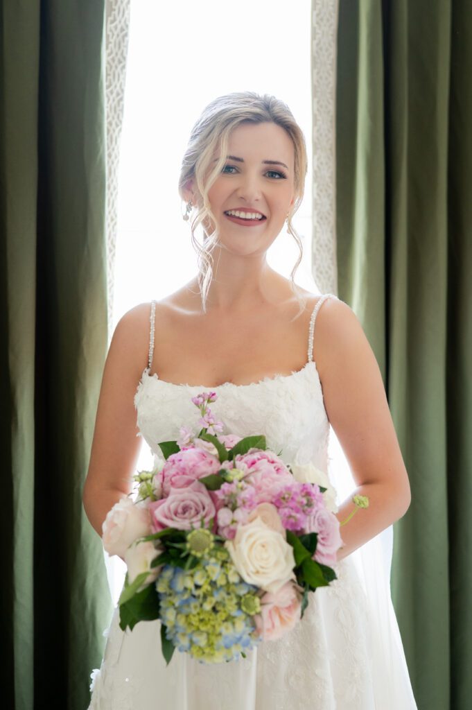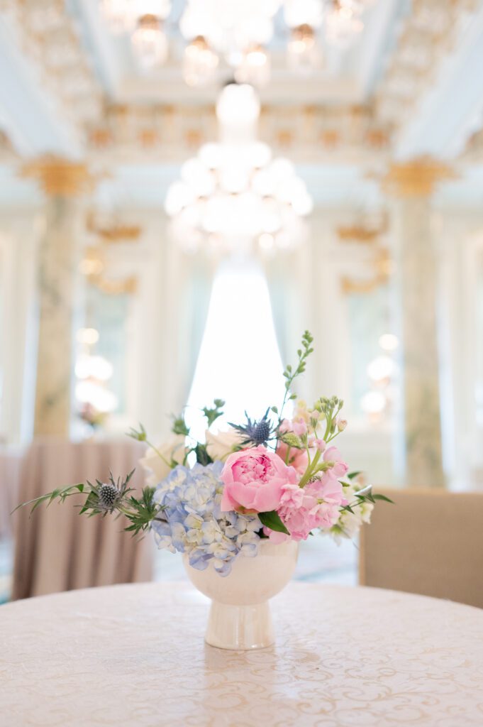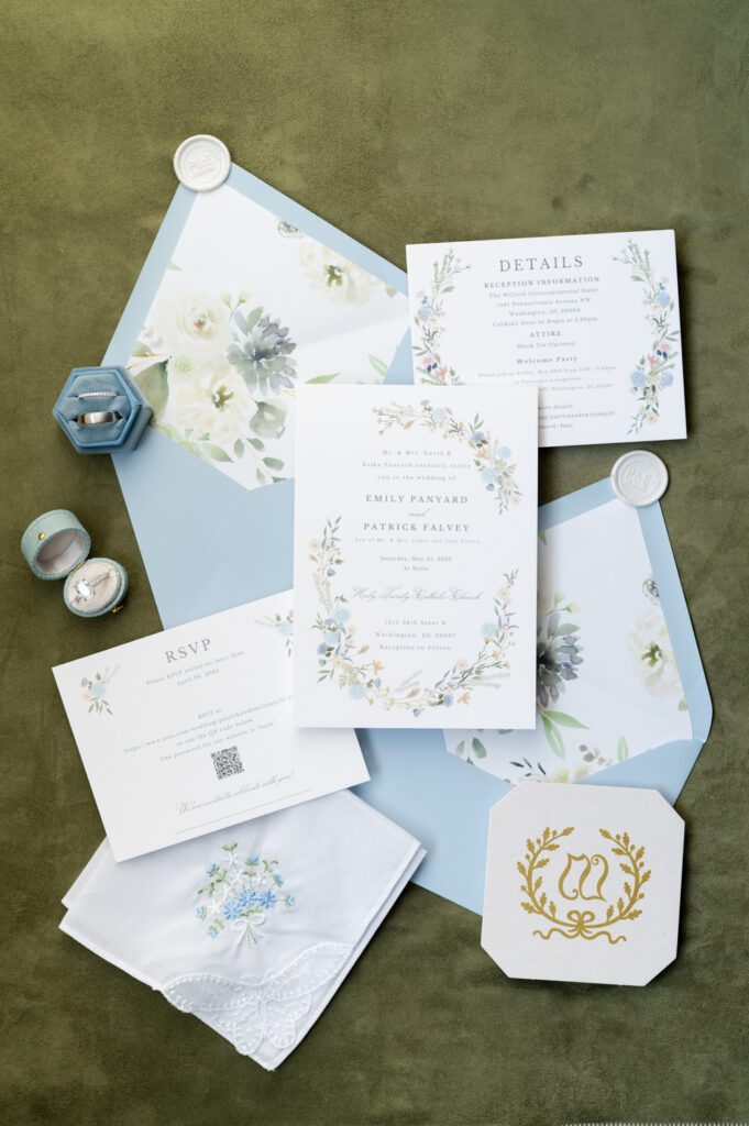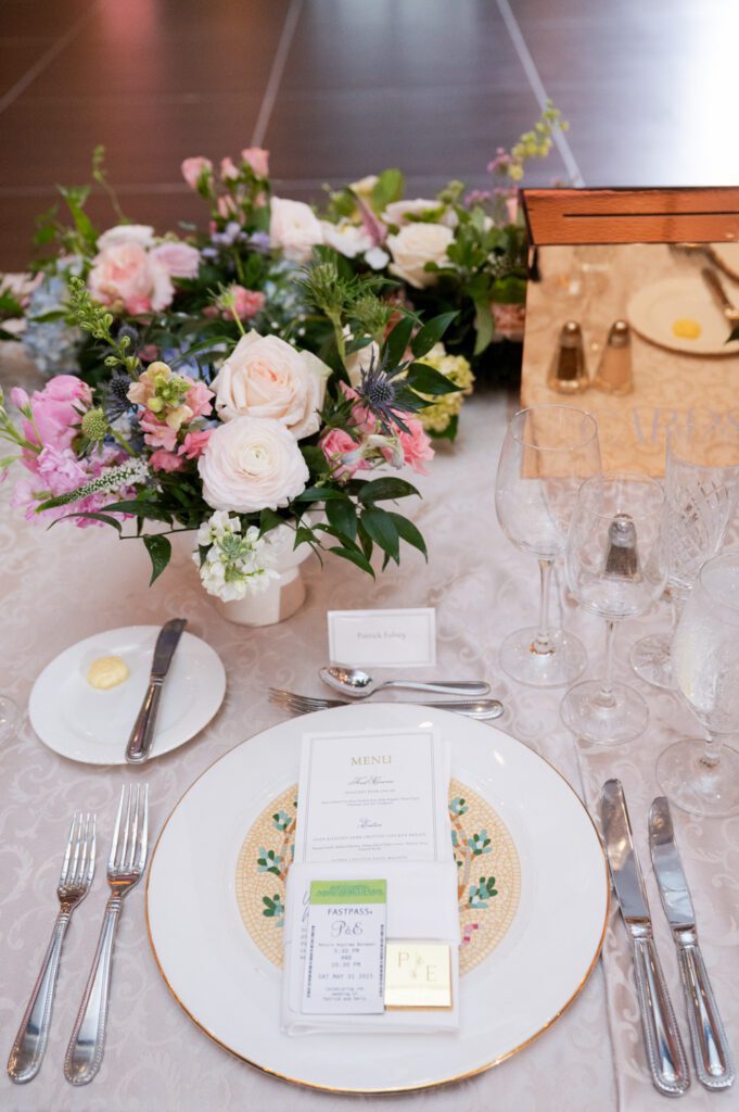 When it came time to plan the wedding, Emily and Patrick wanted an elegant celebration, complete with personal touches like Buzz’s face on the napkins and Disney souvenirs. The color pallet was a timeless spring mix of light blue, sage green, blush pink and white. It was the perfect choice because everywhere we went for photos, those colors were not only present but bursting into frame.