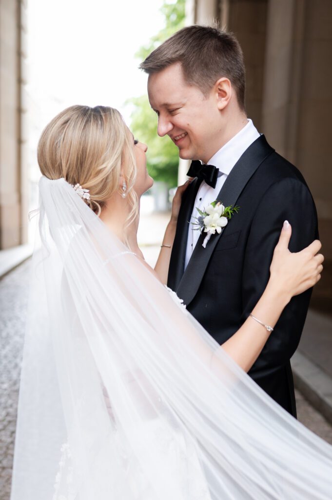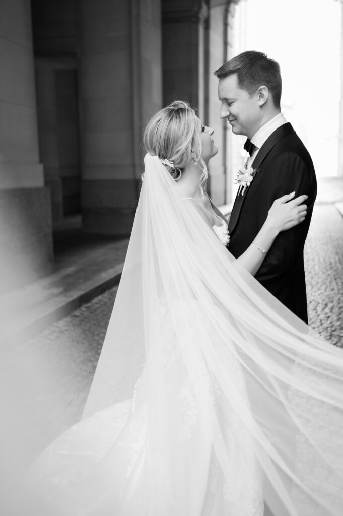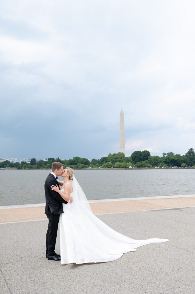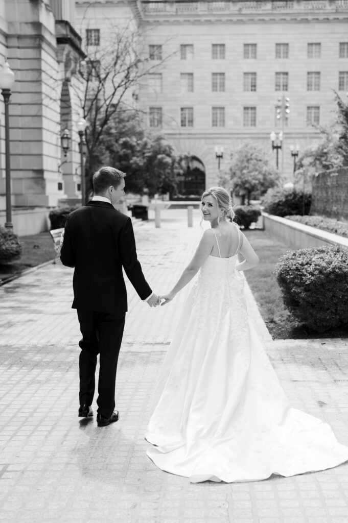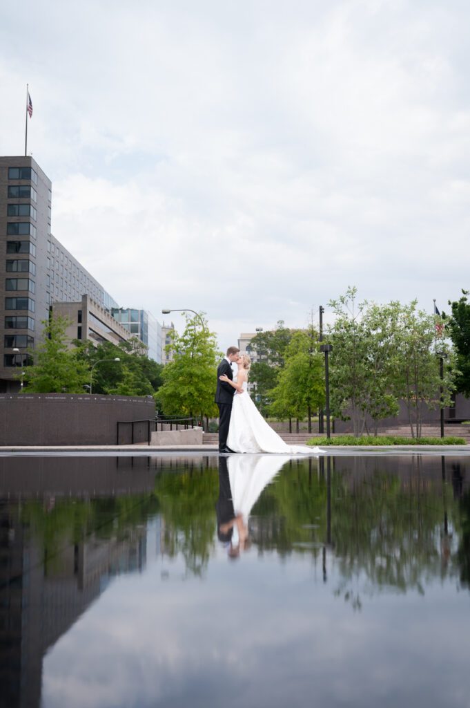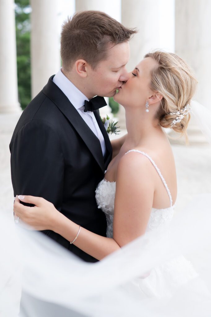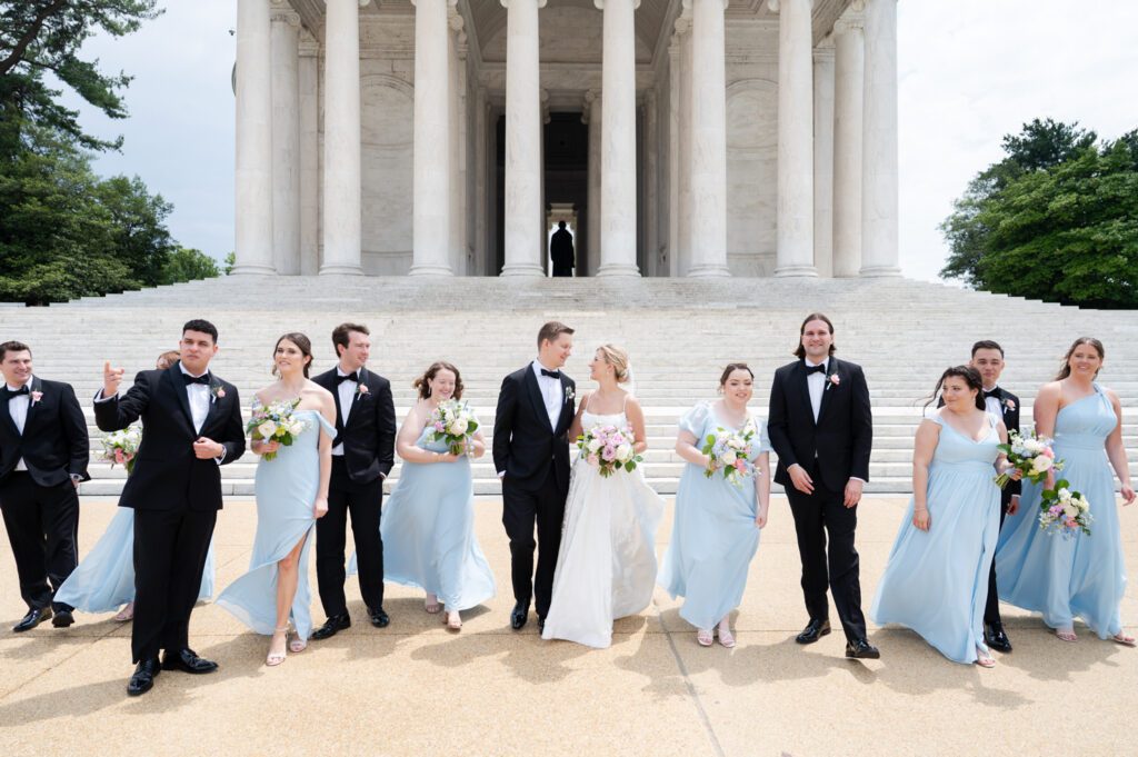 Emily and Patrick took their vows at the Holy Trinity Catholic Church in Georgetown, but not before having a quick first look in the garden. Each photo from the ceremony looked like something out of victorian painting. Up next, we hopped on the bus and went to several iconic locations in Washington DC; Jefferson Monument, the Federal Triangle and WWI Memorial. The photo of them walking up the steps at the Jefferson Monument – Wow!